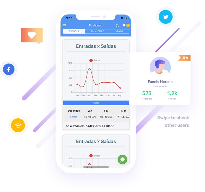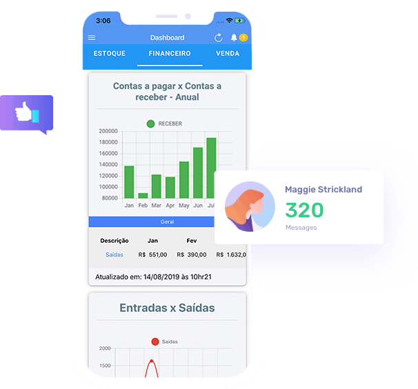 Agora explore os recursos do app. São vários gráficos, listas e informações do seu negócio.